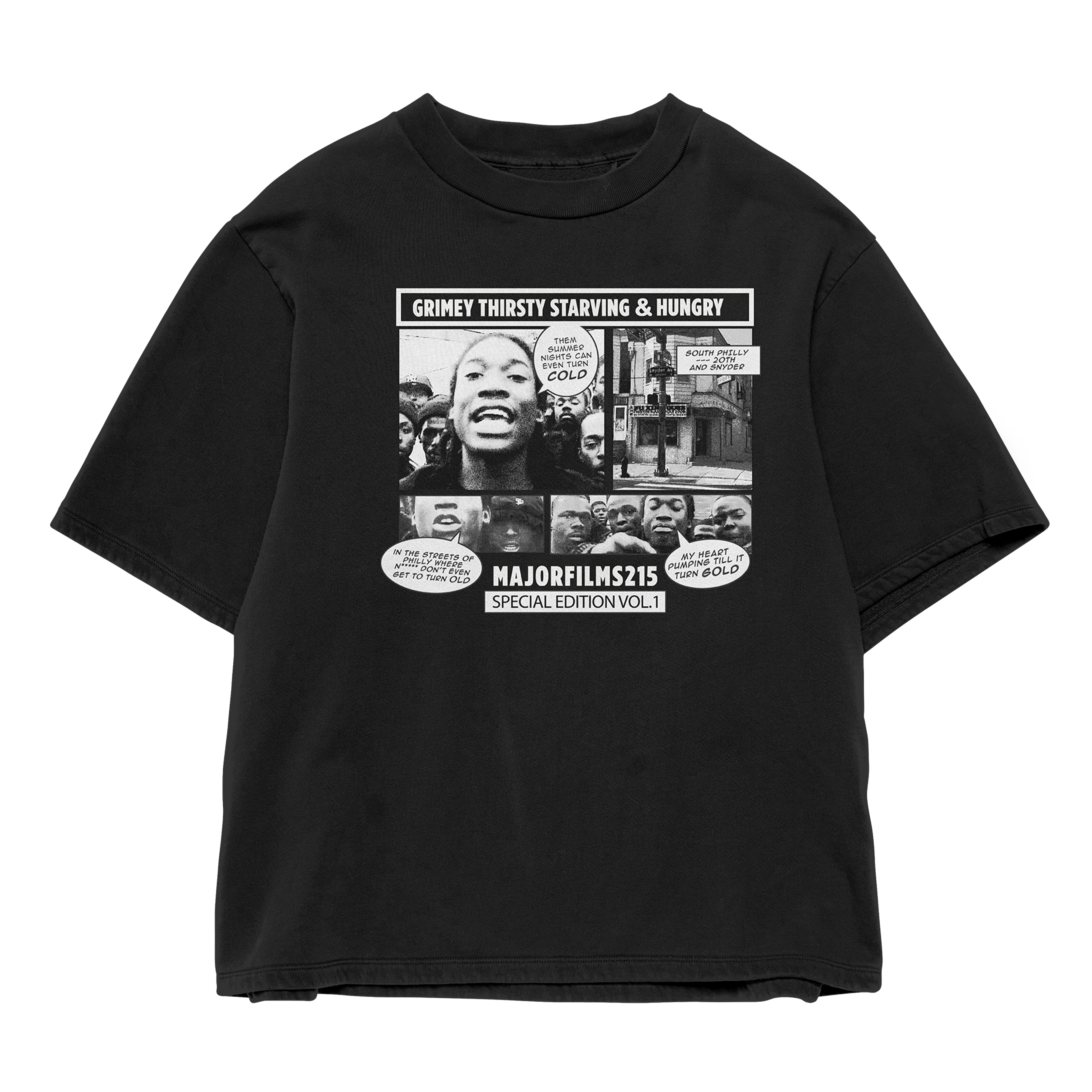 From the gritty corners of Philly to global stages, this limited edition tee pays homage to the raw, unfiltered energy of Meek Mill’s come-up—captured through the lens of Major Films . Inspired by the early videos that helped shape the voice of the streets, Vol. 1 turns Meek's most iconic early bars into a bold comic-style design that hits like a classic freestyle.